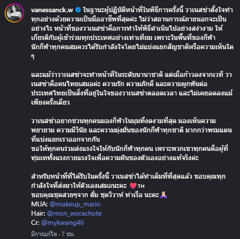 สำหรับหน้าที่ที่ได้รับในครั้งนี้ วาเนสซ่าได้ทำเต็มที่ที่สุดแล้ว ขอบคุณทุกกำลังใจที่ส่งมาให้ตัวเองเสมอนะคะ