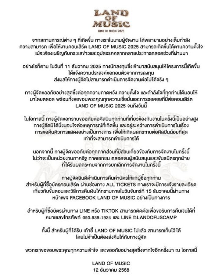 สำหรับการ คืนเงินค่าบัตร ผู้ที่ซื้อผ่าน All Tickets จะมีการแจ้งขั้นตอนอย่างละเอียดภายในวันจันทร์ที่ 15 ธันวาคมนี้ ทางเพจ Facebook Land of Music ส่วนผู้ที่ซื้อผ่าน LINE หรือ TikTok สามารถติดต่อขอคืนเงินได้ที่หมายเลข 093-939-1924 หรือ Line @landofuscamp