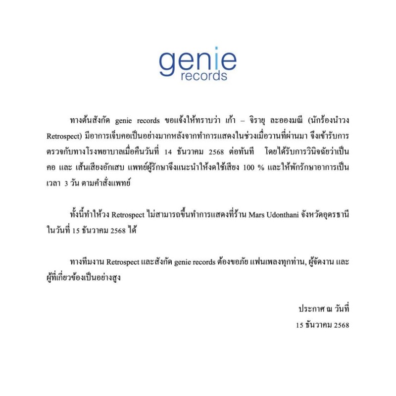 ทำเอาแฟนเพลงวง Retrospect มีใจหายกันยกใหญ่ หลัง เก้า จิรายุ ว้ากเกอร์หนุ่ม ทรุดหนักจนต้องหามส่งโรงพยาบาลและแอดมิทเป็นการด่วน สาเหตุจากการฝืนใช้เสียงอย่างหนัก ทั้งที่ร่างกายไม่สบายอยู่แล้ว ส่งผลให้คอและเส้นเสียงอักเสบรุนแรง จนคุณหมอสั่ง งดใช้เสียง 100% เป็นเวลา 3 วัน
