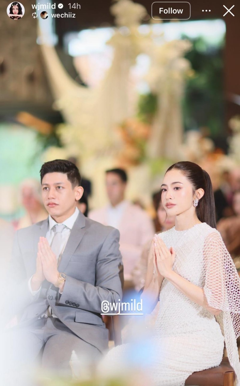 ชุดที่ 1 ชุดแถลงข่าว ทางเจ้าบ่าวเจ้าสาว มายด์-พาย ก็ได้ปรากฏตัวในลุคแรก แถลงวิวาห์กับสื่อมวลชน