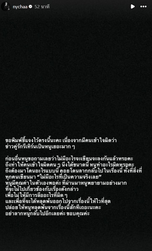 ก่อนอื่นหนูขอถามเลยว่าไม่มีอะไรจะเขียนจะลงกันแล้วหรอคะ ถึงทำให้คนเข้าใจผิดคนๆ นึงได้ขนาดนี้ หนูทำอะไรผิดหรอคะ ถึงต้องมาโดนอะไรแบบนี้ คอยโดนลากกลับไปในเรื่องนี้ ทั้งที่สิ่งที่ทุกคนเขียนมาไม่มีอะไรที่เป็นความจริงเลยหุนูมีคุณค่าในตัวเองพอค่ะ ที่ผ่านมาหนูพยายามอย่างมาก ที่จะไม่ไปเกี่ยวข้องกับเรื่องดังกล่าว พร้อมกับขอให้เธอนั้นได้หลุดพ้น