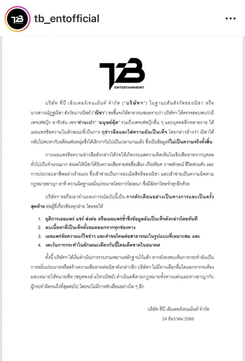 ล่าสุดต้นสังกัด T.B. Entertainment ได้ออกแถลงการณ์อย่างเป็นทางการว่าการกระทำดังกล่าวเข้าข่ายละเมิดสิทธิส่วนบุคคล และอาจเป็นความผิดตามกฎหมาย ทั้งทางแพ่งและทางอาญา โดยเฉพาะในข้อหาหมิ่นประมาทโดยการโฆษณาและขอให้ ยุติการเผยแพร่ แชร์ หรือส่งต่อข้อมูลอันเป็นเท็จทันที