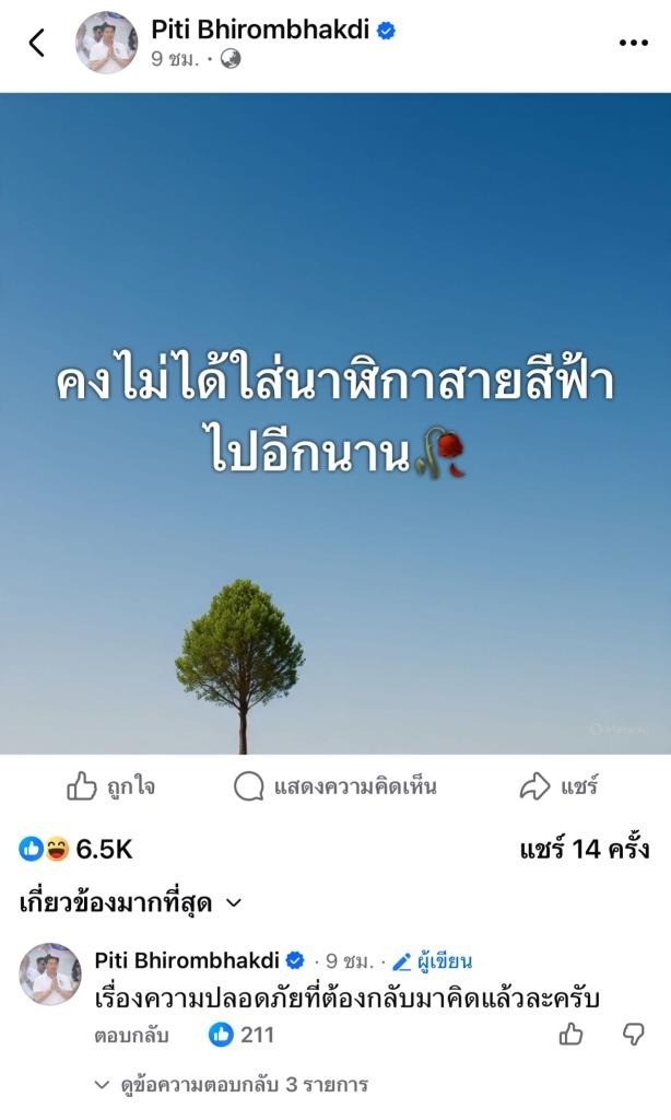งานนี้ทำเอา หนุ่มต๊อด ถึงกับนั่งไม่ติด ต้องรีบออกมาโพสต์ข้อความผ่านโซเชียลว่า คงไม่ได้ใส่นาฬิกาสายสีฟ้าไปอีกนานพร้อมคอมเมนต์เพิ่มเติมใต้โพสต์ว่า รื่องความปลอดภัยที่ต้องกลับมาคิดแล้วละครับ ก่อนที่ต่อมาจะโพสต์ภาพนาฬิกาเรือนใหม่ ราคาหลักพัน ชนิดที่ว่าให้เข้ากับสไตล์หนุ่มออฟฟิศ