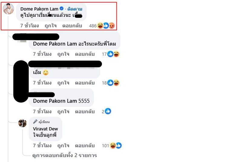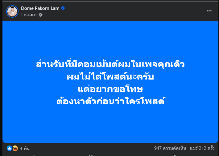 ล่าสุด เพจเฟซบุ๊ก Dome Pakorn Lam ได้ออกมาโพสต์ถุงคอมเมนต์ดังกล่าว ระบุว่า สำหรับที่มีคอมเม้นต์ผมในเพจคุณดิว ผมไม่ได้โพสต์นะครับ แต่อยากขอโทษ ต้องหาตัวก่อนว่าใครโพสต์