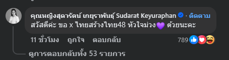 ต่อมาคุณหญิงสุดารัตน์ ได้เข้ามาแสดงความคิดเห็นต่อภาพดังกล่าวระบุว่า สวัสดีค่ะ ขอ x ไทยสร้างไทย48 หัวใจม่วง ด้วยนะคะ