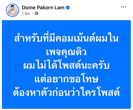 ต่อมา โดม ปกรณ์ ลัม โพสต์ชี้แจงแล้ว บอกว่า สำหรับที่มีคอมเมนต์ผมในเพจคุณดิว ผมไม่ได้โพสต์นะครับ แต่อยากขอโทษ ต้องหาตัวก่อนว่าใครโพสต์
