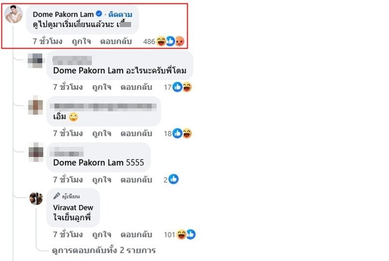 จากกรณีที่ก่อนหน้านี้ โดม ปกรณ์ ลัม โผล่เมนต์ภาพ จินนี่ เชิงคุกคาม ซึ่ง ดิว ก็เข้ามาคอมเมนต์ถึงโดมด้วยว่า ใจเย็นลูกพี่ ขณะที่หลายคนก็มาคอมเมนต์ อาทิ ห้ามใจไว้ครับ , ใจเย็นครับพ่อใหญ่โดม , ลูกพี่แพ้เสียงในหัว 555 ปั่นไม่ไหว เป็นต้น แต่งานนี้ส่อดราม่าหนักมีหลายคนไม่พอใจกับคอมเมนต์ของโดม พร้อมซัดกลับด้วย อาทิ เพศแม่มึxค่ะ หยาบแล้วไม่ได้เท่เสมอไป