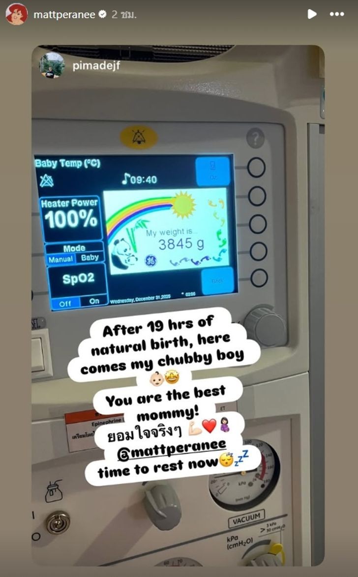 แถมมีการเปิดเผยว่าสาวแมทเลือกคลอดด้วย วิธีธรรมชาติ และต้องนอนรอปวดท้องนานมาราธอนกว่า 19 ชั่วโมง จนในที่สุด น้องภีรันทร์ ออกมาจ้ำม่ำน่าฟัดด้วยน้ำหนักตัวถึง 3,845 กรัม ด้านคุณพ่อป้ายแดงก็เห่อลูกชายสุดๆ เฝ้าดูแลภรรยาไม่ห่างขอบเตียง