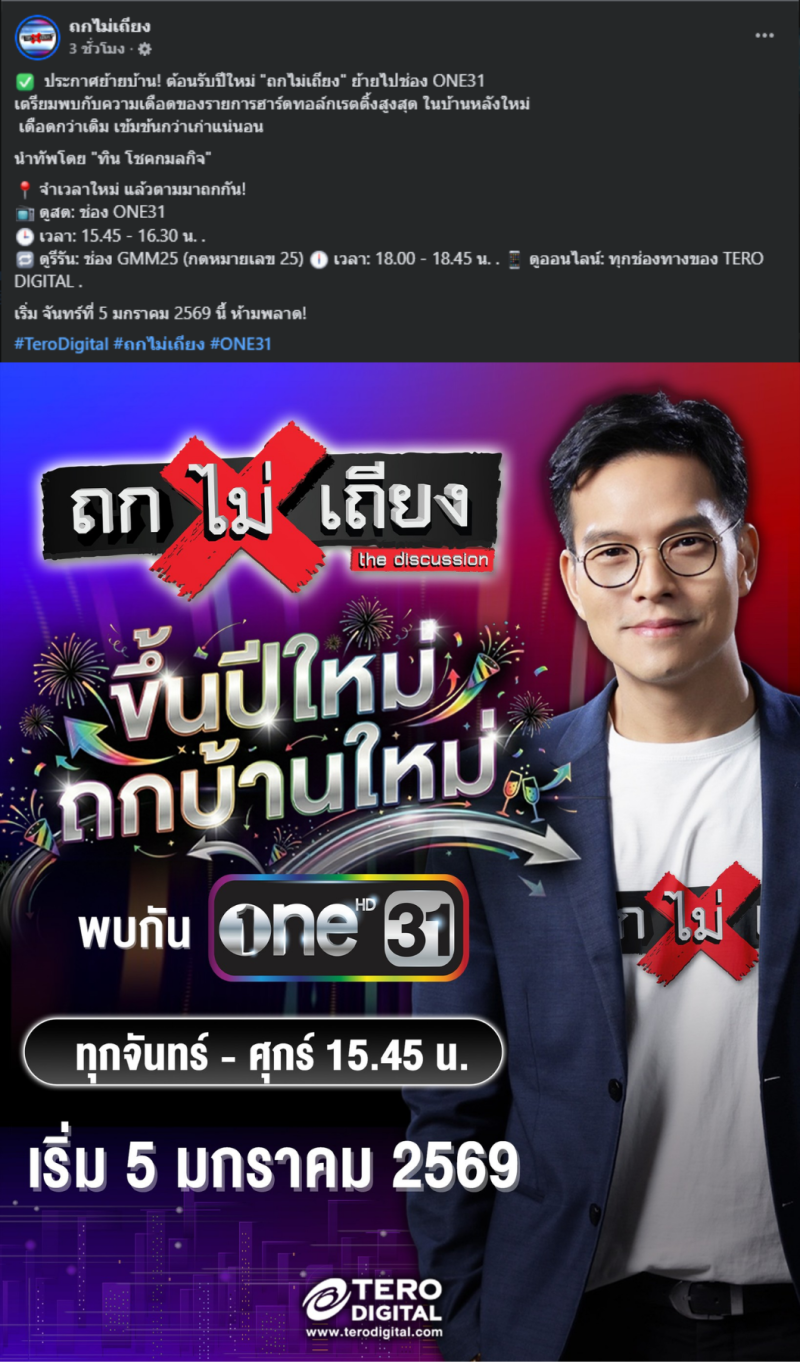 ล่าสุด วันที่ 1 ธันวาคม 2568 เพจ ถกไม่เถียง ได้ประกาศข่าวดี ย้ายบ้านต้อนรับปีใหม่ โดยรายการเตรียมออกอากาศในบ้านหลังใหม่ทางช่อง ONE31 พร้อมความเดือดและความเข้มข้นที่มากกว่าเดิม นำทัพโดย ทิน โชคกมลกิจ
