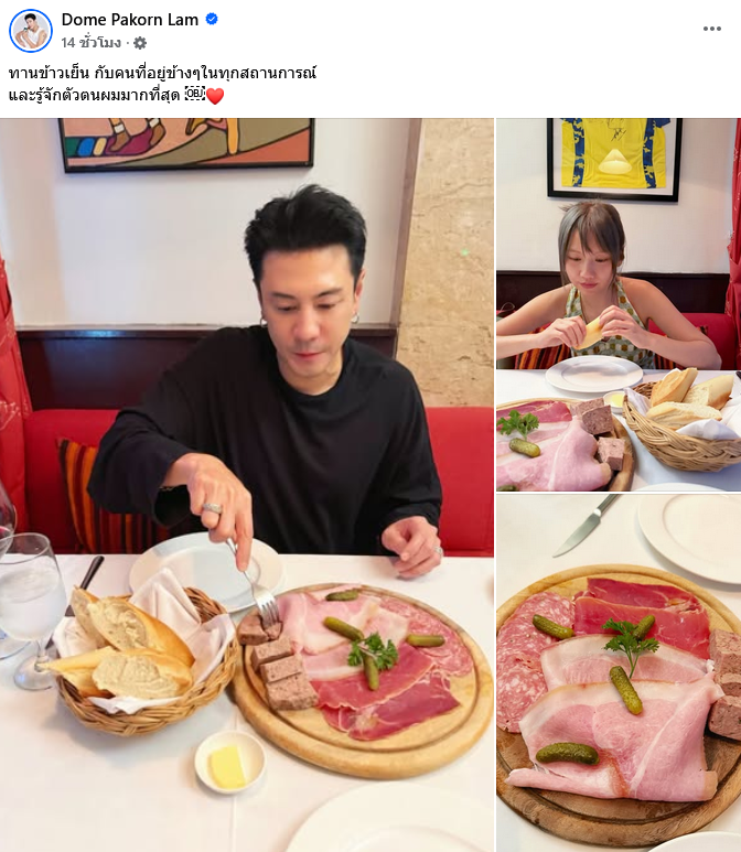 ล่าสุด เจ้าตัวได้ออกมาโพสต์ภาพหวานขณะรับประทานอาหารมื้อเย็น พร้อมข้อความ ผ่านเพจเฟซบุ๊ก Dome Pakorn Lam โดยระบุว่า ทานข้าวเย็น กับคนที่อยู่ข้าง ๆ ในทุกสถานการณ์ และรู้จักตัวตนผมมากที่สุด พร้อมกับอิโมจิรูปหัวใจสีเเดง 1 ดวง