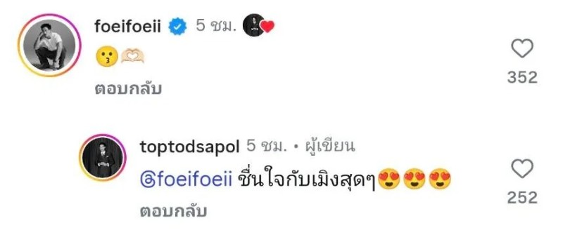 โดยมี เฟย เข้ามาคอมเมนต์หน้าจุ๊บ และสัญลักษณ์ให้หนุ่มท็อป ซึ่งเจ้าตัวก็เลยตอบกลับไปว่า ชื่นใจกับเมิงสุดๆ