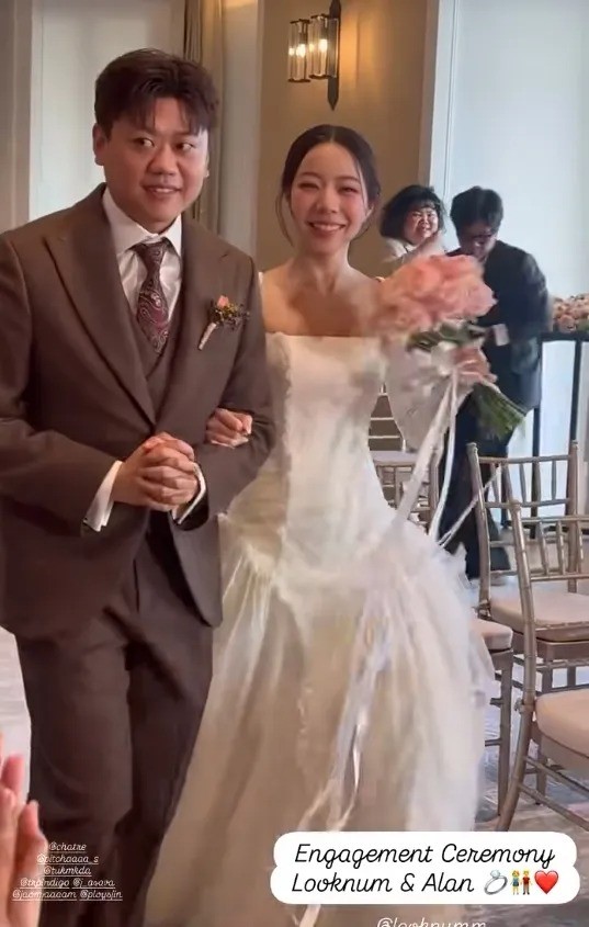 เท่านั้นยังไม่พอ ในพิธีช่วงค่ำ ก็มียังโมเมนต์น้ำตาซึม เมื่อคุณพ่อของลูกน้ำ ได้เดินควงลูกสาวสุดที่รักเข้าสู่ภายในงาน เพื่อส่งมอบให้กับเจ้าบ่าวดูแลต่อ โดยจะเห็นได้ว่าปลายทางนั้น มีการฉายภาพของคุณแม่เพ็กแฮ ใส่ชุดไทยยืนรออยู่จนสุดปลายทาง