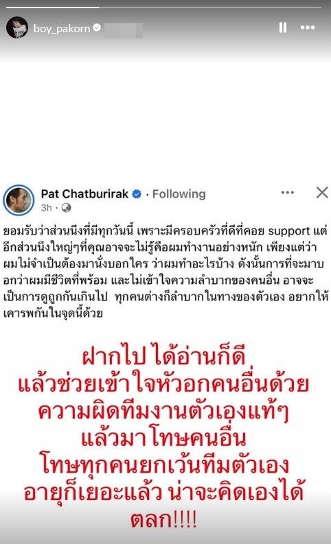 ภัทรยอมรับว่าครอบครัวคือแรงซัพพอร์ตสำคัญ แต่ยืนยันว่าอีกส่วนใหญ่คือการทำงานหนักของตัวเอง พร้อมฝากว่าทุกคนต่างลำบากในทางของตัวเอง ควรเคารพกัน ด้านหน่อง ธนา รีบคอมเมนต์ซัพพอร์ตน้องทันที ขณะที่บอย ปกรณ์ ออกโรงปกป้องแบบจัดเต็ม ฟาดกลับบุคคลปริศนาตรงๆ
