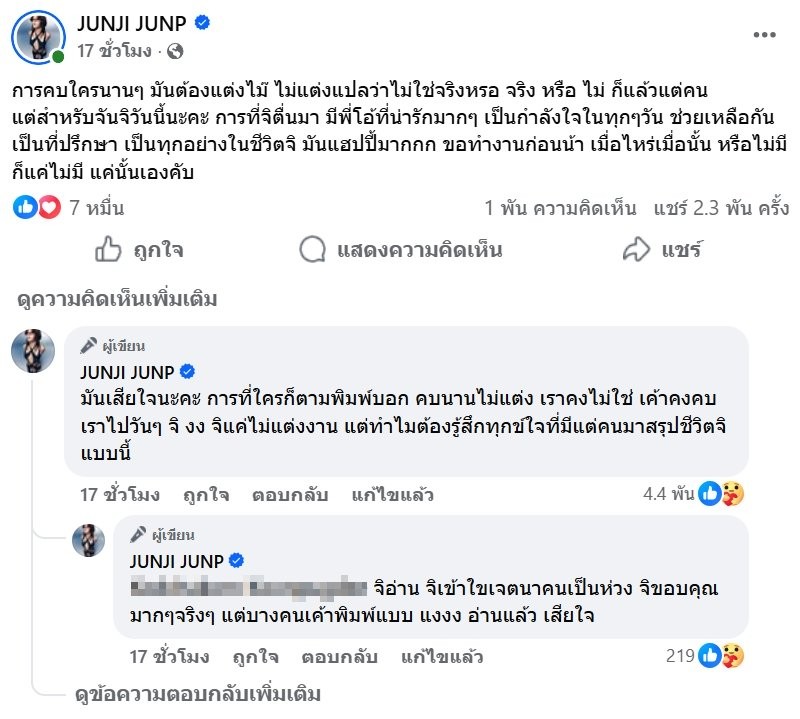 พร้อมยอมรับว่ารู้สึกเสียใจ ที่หลายคนตัดสินชีวิตของเธอ เพียงเพราะคำว่า ‘ยังไม่แต่ง’ ทั้งที่ความรักของแต่ละคนมีรูปแบบไม่เหมือนกัน