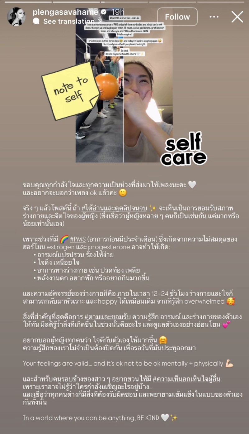 นอกจากนี้ เธอยังฝากข้อความถึงคนรอบข้างให้มีความเห็นอกเห็นใจซึ่งกันและกัน เพราะเราอาจไม่รู้ว่าคนตรงหน้ากำลังเผชิญอะไรอยู่ พร้อมทิ้งท้ายด้วยประโยคสร้างแรงบันดาลใจว่า In a world where you can be anything, be kind.