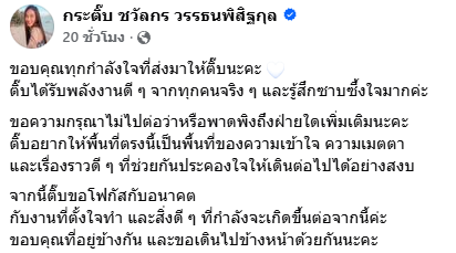 ล่าสุดเจ้าตัวได้ออกมาโพสต์ขอบคุณทุกกำลังใจจากคนบันเทิงและชาวเน็ต ยอมรับว่าได้รับพลังงานดีๆ และรู้สึกซาบซึ้งใจเป็นอย่างมาก พร้อมขอความกรุณาไม่ต่อว่าหรือพาดพิงถึงฝ่ายใดเพิ่มเติม อยากให้พื้นที่ตรงนี้เป็นพื้นที่ของความเข้าใจและความเมตตา