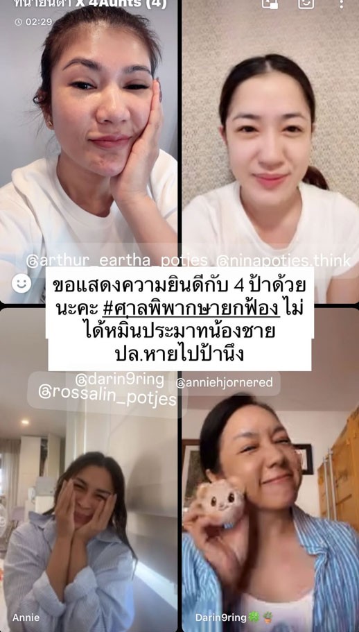 โดย ทนายนิด้า ศรันยา หวังสุขเจริญ ทนายความฝั่งพี่สาว ได้โพสต์สตอรี่หลังฟังคำพิพากษา เป็นภาพวิดีโอคอลกับ 3 ใน 4 พี่สาว พร้อมข้อความแสดงความยินดี ระบุว่า ศาลเห็นว่าไม่ได้เป็นการหมิ่นประมาท