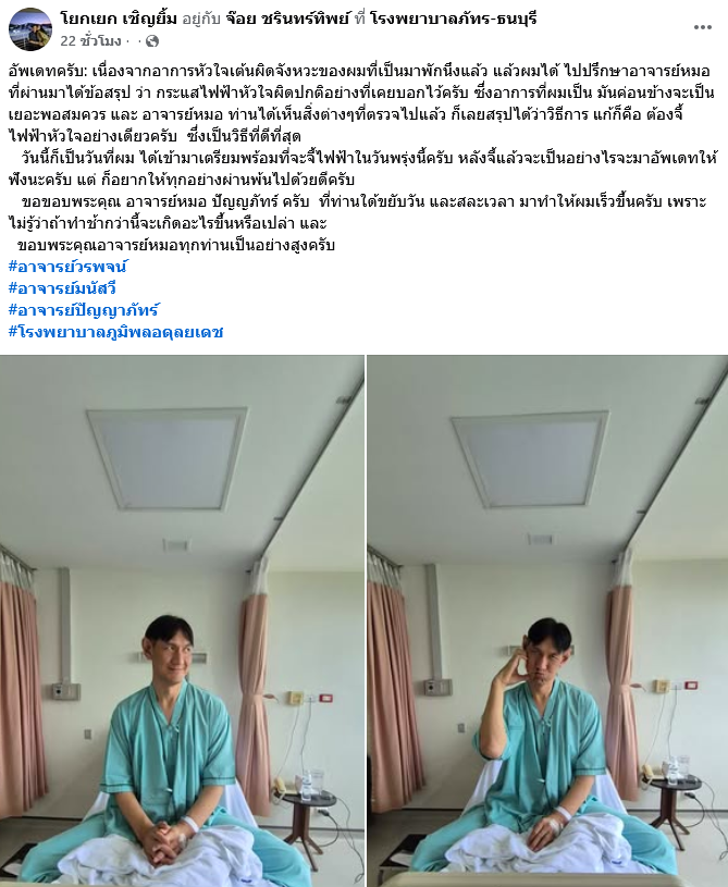 วันนี้ก็เป็นวันที่ผมได้เข้ามาเตรียมพร้อมที่จะจี้ไฟฟ้าในวันพรุ่งนี้ครับ หลังจี้แล้วจะเป็นอย่างไรจะมาอัปเดตให้ฟังนะครับ แต่ก็อยากให้ทุกอย่างผ่านพ้นไปด้วยดีครับ ขอขอบพระคุณ อาจารย์หมอ ปัญญภัทร์ ครับ ที่ท่านใด้ขยับวัน และสละเวลา มาทำให้ผมเร็วขึ้นครับ เพราะไม่รู้ว่าถ้าทำช้ากว่านี้จะเกิดอะไรขึ้นหรือเปล่า และขอบพระคุณอาจารย์หมอทุกท่านเป็นอย่างสูงครับ