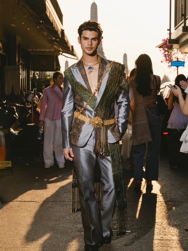 คนที่ 1 แบงค์ ศรราม สวมผ้าไหมแพรวา ปรากฏตัวด้วยชุดจากผ้าไหมแพรวา จังหวัดกาฬสินธุ์โชว์ความงามของลวดลาย ตัดเย็บจาก ผ้าไหมแพรวา และผ้าไหมพื้น พร้อมงานเดรปปิ้งด้วยผ้าไหมแพรวา ช่วยยกระดับลุคให้ดูสง่างาม