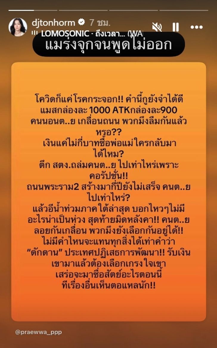 เรียกได้ว่ากลายเป็นประเด็นที่ถูกพูดถึงอย่างมากในโลกออนไลน์ สำหรับ ดีเจต้นหอม ศกุนตลา เทียนไพโรจน์ หลังออกมาโพสต์สตอรี่อินสตาแกรม แสดงความรู้สึกต่อผลการเลือกตั้งที่ผ่านมา ด้วยข้อความสั้นๆ ว่า จุกจนพูดไม่ออก ภายหลังพรรคประชาชนพ่ายแพ้การเลือกตั้งเมื่อวันที่ 8 กุมภาพันธ์ ซึ่งเป็นข้อความสะท้อนความไม่พอใจต่อปัญหาทางการเมืองและสังคมตลอดหลายปีที่ผ่านมา