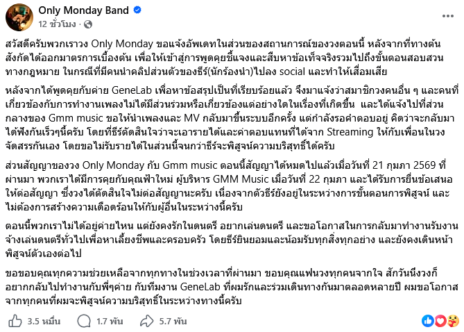 ส่วนสัญญาของวง Only Monday กับ Gmm music ตอนนี้สัญญาได้หมดไปแล้วเมื่อวันที่ 21 กุมภา 2569 ที่ผ่านมา พวกเราได้มีการคุยกับคุณฟ้าใหม่ ผู้บริหาร GMM Music เมื่อวันที่ 22 กุมภา และได้รับการยื่นข้อเสนอให้ต่อสัญญา ซึ่งวงได้ตัดสินใจไม่ต่อสัญญานะครับ เนื่องจากตัวธีร์ยังอยู่ในระหว่างการขั้นตอนการพิสูจน์ และไม่ต้องการสร้างความเดือดร้อนให้กับผู้อื่นในระหว่างนี้ครับ