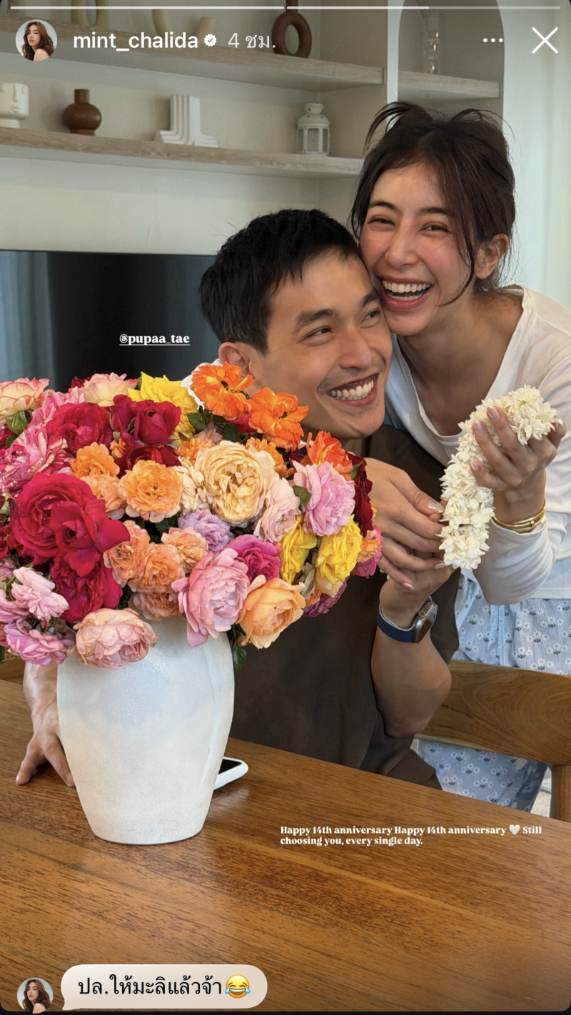 เมื่อนางเอกสาว มิ้นต์ ชาลิดา วิจิตรวงศ์ทอง โพสต์ภาพคู่สุดโรแมนติกฉลองครบรอบกับหวานใจหนุ่ม ภูผา เตชะณรงค์ พร้อมข้อความซึ้งว่า Happy 14th Anniversary I still choose you every day หรือ ฉันยังคงเลือกคุณในทุกๆ วัน