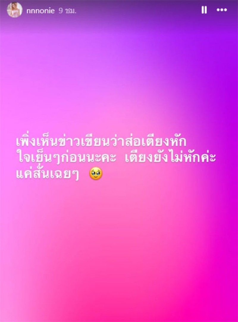 แต่ล่าสุดเจ้าตัวออกมาเบรกดราม่าแบบขำๆ ว่า เพิ่งเห็นข่าวเขียนว่าส่อเตียงหัก ใจเย็นๆ ก่อนนะคะ เตียงยังไม่หักค่ะ แค่สั่นเฉยๆ