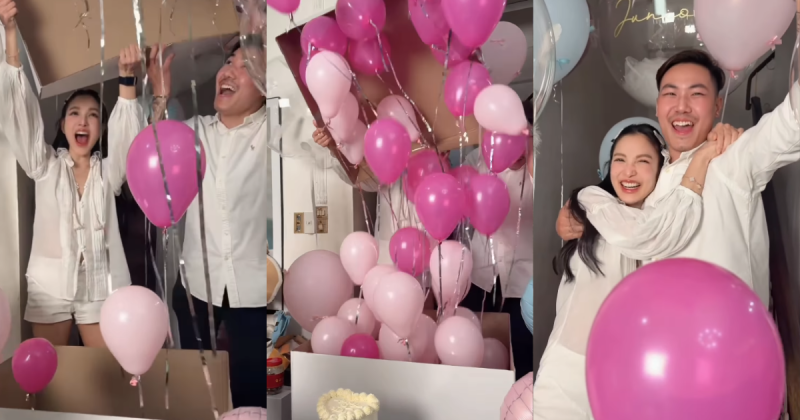 ในระหว่างการทายเพศลูกนั้น หนุ่มพีได้ทายว่าตนเองจะได้ลูกสาว ในขณะที่น้องเรซซิ่งทายว่าจะได้น้องชาย ส่วนทางด้านสาวแพทเผยว่าตนเองรู้ผลเพศลูกแล้วและได้เก็บไว้เป็นความลับอยู่คนเดียว ก่อนที่ทั้งคู่จะทำการเปิดกล่องเพื่อเฉลยเพศลูก ซึ่งปรากฏว่ามีลูกโป่งสีชมพูจำนวนมากลอยขึ้นมาเต็มกล่อง พร้อมกับแก้วตัดเค้กของน้องเรซซิ่งที่เป็นสีชมพูเช่นเดียวกัน ซึ่งเป็นสัญลักษณ์สื่อความหมายว่าทั้งคู่กำลังจะได้ลูกสาว