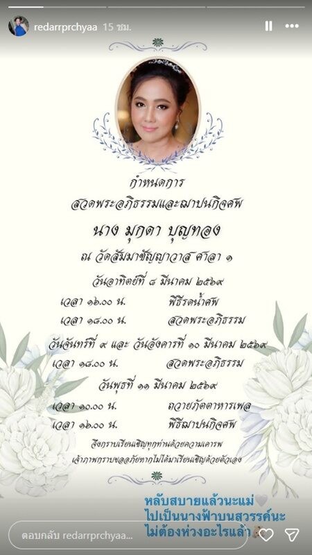โดยลูกสาวได้โพสต์ข้อความอาลัยถึงคุณแม่ว่า หลับสบายแล้วนะแม่ ไปเป็นนางฟ้าบนสวรรค์ ไม่ต้องห่วงอะไรแล้ว ขณะที่ลูกสาวอีกคนได้โพสต์ภาพจับมือคุณแม่ พร้อมข้อความว่า หนูรักแม่มากที่สุด หลับให้สบายนะคะ นางฟ้าของหนู