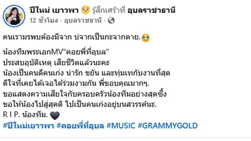 เมื่อวันที่ 9 มีนาคม 2569 นักร้องลูกทุ่งสาว ปีใหม่ เยาวพา เจ้าของตำแหน่งแชมป์ 31 สมัยจากเวที “ดวลเพลงชิงทุน” ได้ออกมาโพสต์ข้อความแสดงความอาลัยต่อการจากไปของ น้องทีม พระเอกมิวสิกวิดีโอเพลง “คอยพี่ที่อุบล” ซึ่งประสบอุบัติเหตุและเสียชีวิตอย่างกะทันหัน