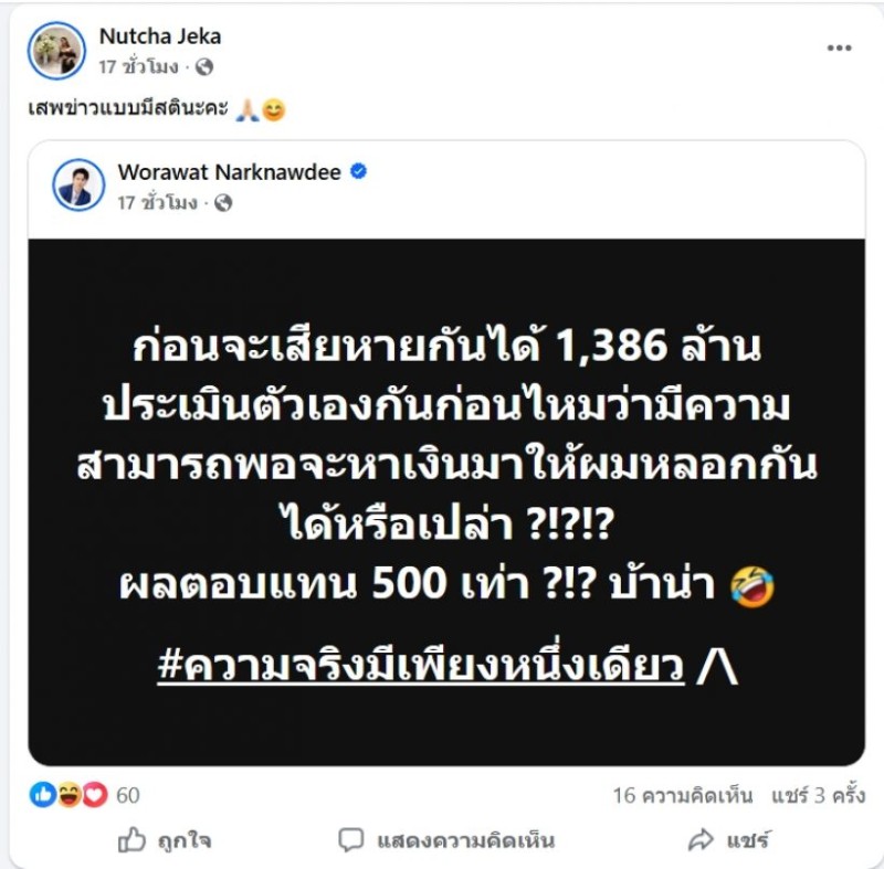 ล่าสุด แอ็คมี่ วรวัฒน์ ได้โพสต์ข้อความผ่านเฟซบุ๊กส่วนตัว โต้กระแสข่าว พร้อมตั้งคำถามถึงตัวเลขความเสียหาย 1,386 ล้านบาท โดยระบุว่า ก่อนจะบอกว่าถูกหลอก ควรประเมินตัวเองก่อนว่ามีศักยภาพหาเงินจำนวนมากพอให้ตนหลอกได้จริงหรือเปล่า