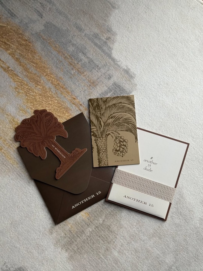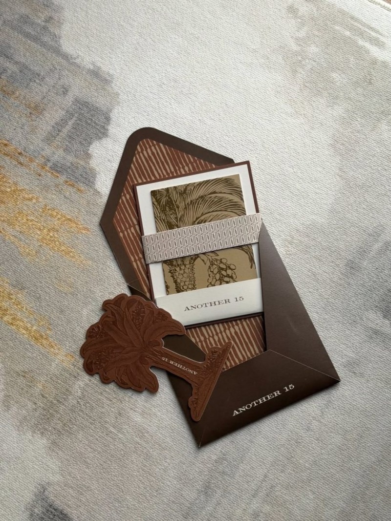 ล่าสุดว่าที่เจ้าสาวได้เผยภาพการ์ดแต่งงาน ดีไซน์มินิมอลในโทนสีน้ำตาลอบอุ่น ตัวซองดูเรียบหรู ขณะที่ด้านในการ์ดตกแต่งด้วยลวดลายต้นปาล์มเพิ่มความโดดเด่น อีกหนึ่งจุดที่สะดุดตา คือข้อความบนการ์ดที่สื่อถึง วันที่ 15 ซึ่งถือเป็นวันสำคัญของทั้งคู่