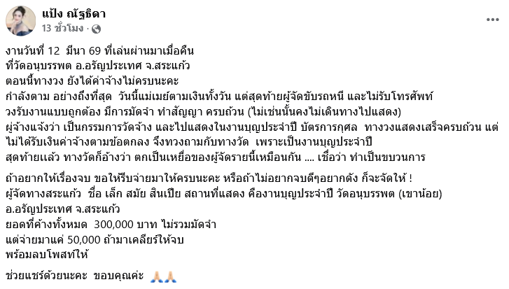สุดท้ายเเล้ว ทางวัดก็อ้างว่า ตกเป็นเหยื่อของผู้จัดรายนี้เหมือนกัน เชื่อว่า ทำเป็นขบวนการ ถ้าอยากให้เรื่องจบ ขอให้รีบจ่ายมาให้ครบนะคะ หรือถ้าไม่อยากจบดี ๆ อยากดัง ก็จะจัดให้ สถานที่แสดง คืองานบุญประจำปี วัดอนุบรรพต (เขาน้อย) อ.อรัญประเทศ จ.สระแก้ว ยอดที่ค้างทั้งหมด 300,000 บาท ไม่รวมมัดจำ แต่จ่ายมาแค่ 50,000 ถ้ามาเคลียร์ให้จบ พร้อมลบโพสต์ให้ ช่วยแชร์ด้วยนะคะ ขอบคุณค่ะ
