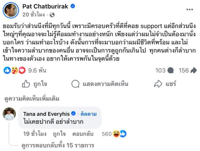 กลายเป็นประเด็นร้อนในโลกออนไลน์ หลัง ภัทร ฉัตรบริรักษ์ น้องชายคนเล็กของบ้านฉัตรบริรักษ์ ออกมาโพสต์ข้อความเดือดเกี่ยวกับปัญหาในการทำงาน จนทำให้หลายคนจับตามอง และพี่ชายอย่าง บอย ปกรณ์ กับ หน่อง ธนา ต้องออกมาแสดงความคิดเห็น
