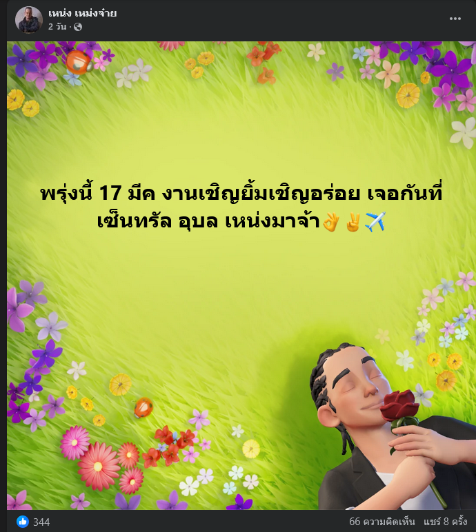 อย่างไรก็ตามจากการจรวจสอบเพจเฟซบุ๊ก เหน่ง เหม่งจ๋าย โพสต์สุดท้ายเมื่อวันที่ 16 มีนาคม 2569 ที่ผ่านมา ระบุว่า พรุ่งนี้ 17 มีค งานเชิญยิ้มเชิญอร่อย เจอกันที่ เซ็นทรัล อุบล เหน่งมาจ้า