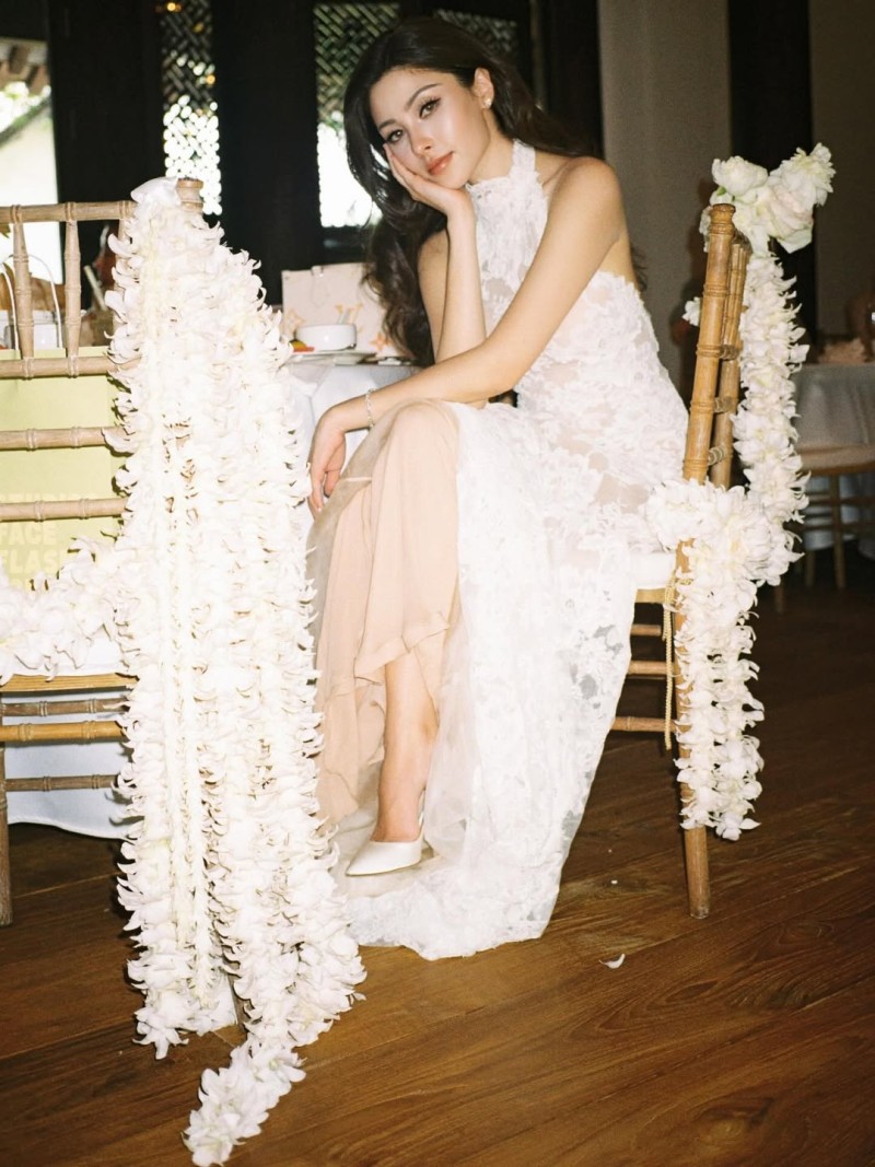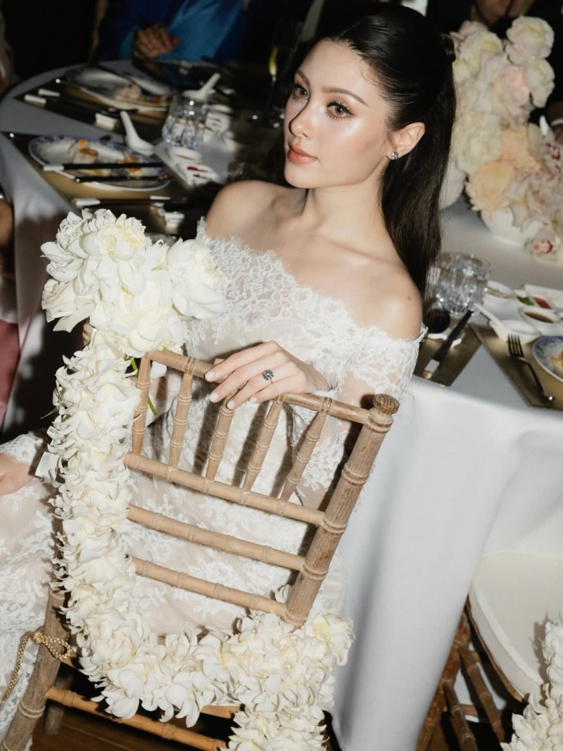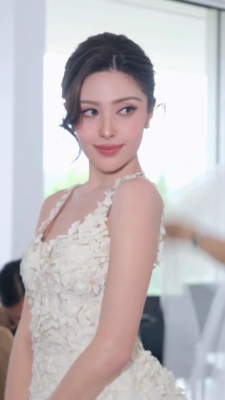ชุดที่ 2 งานวิวาห์ครั้งนี้ เจ้าสาวยังปรากฎตัวอีกลุค ด้วยเดรสลูกไม้สีขาว