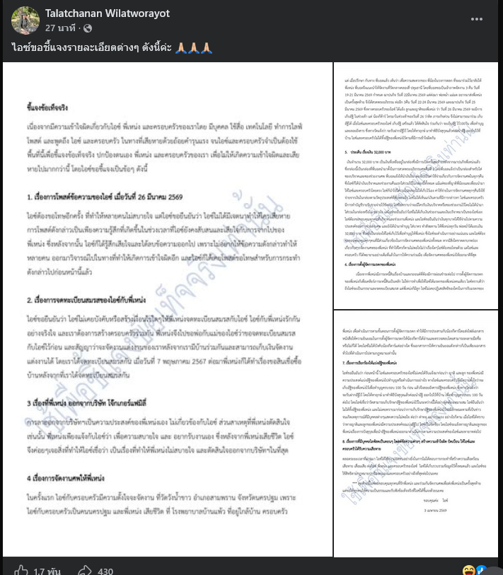 เนื่องจากมีความเข้าใจผิดเกี่ยวกับไอซ์ พี่เหน่ง และครอบครัวของเราโดย มีบุคคลใช้สื่อ เทคโนโลยี ทำการไลฟ์ โพสต์ และพูดถึง ไอซ์ และครอบครัว ในทางที่เสียหายด้วยถ้อยคำรุนแรง จนไอซ์และครอบครัวจำเป็นต้องใช้พื้นที่นี้เพื่อชี้แจงข้อเท็จจริง ปกป้องตนเอง พี่เหน่ง และครอบครัวของเรา เพื่อไม่ให้เกิดความเข้าใจผิดและเสียหายไปมากกว่านี้ โดยไอซ์ขอชี้แจงเป็นข้อๆ ดังนี้