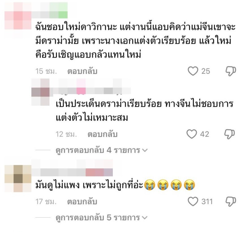 ชาวเน็ตไทยจำนวนไม่น้อยเข้ามาแสดงความคิดเห็นเกี่ยวกับชุดดังกล่าว เช่น มองว่าชุดแม้จะสวยแต่ดูไม่เหมาะกับกาลเทศะ บางคนรู้สึกว่าทำให้ลุคโดยรวมดูไม่หรูหราเท่าที่ควร ขณะที่อีกส่วนมองว่าอาจไม่เข้ากับธีมของงานเปิดตัวซีรีส์