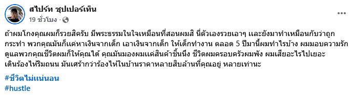 ตลอด 5 ปีมานี้ผมทำไรบ้าง ผมมอบความรัก ดูแลพวกคุณชีวิตผมก็ให้คุณได้ คุณมันมองผมเเค่สินค้าชิ้นนึง ชีวิตผมครอบครัวผมพัง ผมเสียอะไรไปเยอะ เดินร้องไห้ริมถนน มันเศร้ากว่าร้องไห้ในบ้านราคาหลายสิบล้านที่คุณอยู่หลายเท่านะ พร้อมกันติดแฮชแท็กข้อความว่า ชีวิตไม่เเน่นอน, hustle