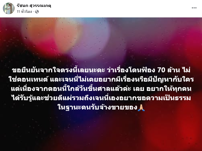 เรียกได้ว่าทำเอาแฟน ๆ แห่กันออกมาส่งกำลังใจรัว ๆ เมื่อเจนนี่ ได้หมดถ้าสดชื่น หรือ เจนนี่ รัชนก สุวรรณเกตุ นักร้องสาวคนดัง ที่ช่วงนี้เรียกได้ว่ากลับมาปังสุดขีด หลังผ่านมรสุมชีวิตครั้งใหญ่เรื่องหนี้สินของคุณแม่มาได้สักพัก ได้ออกมาโพสต์ข้อความผ่านบัญชีเฟซบุ๊กส่วนตัว รัชนก สุวรรณเกตุ โดยระบุว่า ขอยืนยันจากใจตรงนี้เลยนะคะ ว่าเรื่องโดนฟ้อง 70 ล้าน ไม่ใช่คอนเทนต์ และเจนนี่ไม่เคยอยากมีเรื่องหรือมีปัญหากับใคร แต่เนื่องจากตอนนี้ใกล้วันขึ้นศาลแล้วค่ะ เลย อยากให้ทุกคนได้รับรู้และช่วยตีแผ่รวมถึงเจนนี่เองอยากขอความเป็นธรรมในฐานะคนรับจ้างขายของ