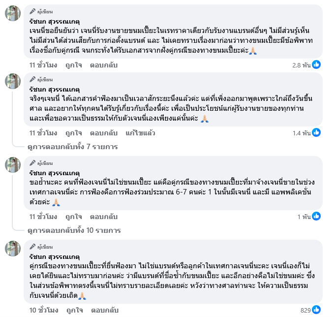 ต่อมาเจนนี่ ยังได้เขียนข้อความระบุเพิ่มเติมในคอมเมนต์ใต้โพสต์ดังกล่าวด้วยว่า เจนนี่ขอยืนยันว่า เจนนี่รับงานขายขนมเปี๊ยะในเรทราคาเดียวกับรับงานแบรนด์อื่น ๆ ไม่มีส่วนรู้เห็น ไม่มีส่วนได้ส่วนเสียกับการก่อตั้งแบรนด์ และไม่เคยทราบเรื่องมาก่อนว่าทางขนมเปี๊ยะมีข้อพิพาทเรื่องชื่อกับคู่กรณี จนกระทั่งได้รับเอกสารจากฝั่งคู่กรณีของทางขนมเปี๊ยะค่ะ