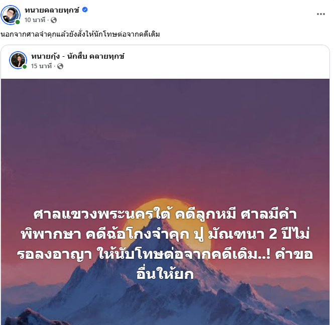 ด้านเพจ ทนายคลายทุกข์ ได้โพสต์ข้อความแจ้งข่าวการตัดสินคดีนี้เช่นกัน โดยระบุว่า “#ข่าวด่วน ศาลแขวงพระนครใต้พิพากษา จำคุกปูมัณฑนา ข้อหาฉ้อโกง 2 ปีไม่รอลงอาญา”
