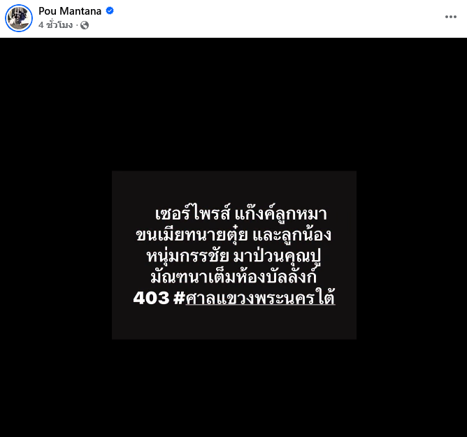 ประเด็นหลักคือวันนี้ (21 เมษายน 2569) ศาลมีคำพิพากษาว่า ปู มัณฑนา จำคุก 2 ปี ไม่รอลงอาญา ซึ่งคุณปูมีสิทธิที่จะประกันตัวเพื่อประกันตัวต่อไป ซึ่งเป็นเรื่องระหว่างคุณปูและคุณลูกหมี ซึ่งผมไม่เกี่ยว แต่ผมมีประเด็นที่ไม่สบายใจ คือ มีข้อความที่ตนสงสัยว่า ปู มัณฑนา เป็นคนโพสต์ ระบุว่า เซอร์ไพรส์ แก๊งลูกหมา ขนเมียทนายตุ๋ย และลูกน้องหนุ่มกรรชัย มาป่วนคุณปู มัณฑนาเต็มห้องบัลลังก์ 403 ศาลแขวงพระนครใต้ พร้อมลงเพลงอีลูกช่างสอด ของจ๊ะ นงผณี
