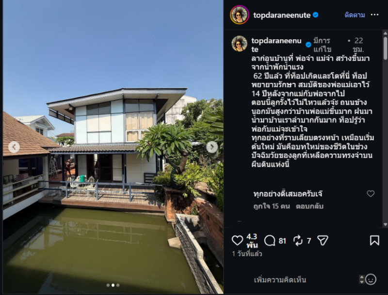 วันที่ 22 เมษายน 2569 ดารณีนุช โพธิปิติ โพสต์อินสตาแกรมส่วนตัว topdaraneenute เผยข่าวเศร้า จำใจต้องทุบบ้านเก่าที่พ่อแม่สร้างไว้ หลังพยายามดูแลรักษามานานกว่า 14 ปี แต่ไม่สามารถต้านสภาพแวดล้อมที่เปลี่ยนไปได้ โดยเฉพาะระดับถนนที่สูงขึ้นจนทำให้เกิดปัญหาน้ำท่วมซ้ำซาก
