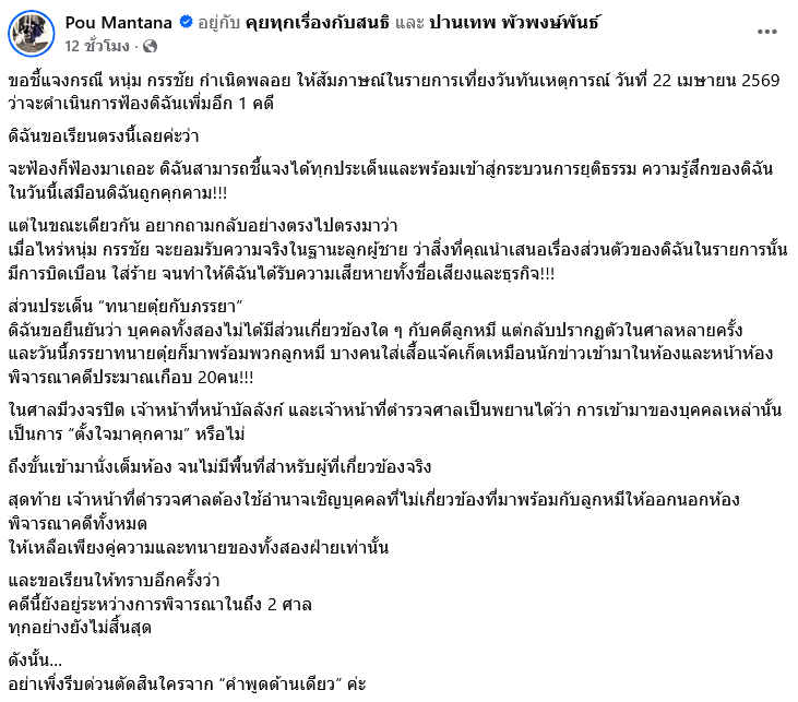 ล่าสุด ด้าน ปู มัณฑนา ก็ได้ออกมาเคลื่อนไหวถึง หนุ่ม กรรชัย พร้อมกับชี้แจงประเด็นดังกล่าว ผ่านบัญชีเฟซบุ๊กส่วนตัว Pou Mantana โดยระบุว่า ขอชี้แจงกรณี หนุ่ม กรรชัย กำเนิดพลอย ให้สัมภาษณ์ในรายการเที่ยงวันทันเหตุการณ์ วันที่ 22 เมษายน 2569 ว่าจะดำเนินการฟ้องดิฉันเพิ่มอีก 1 คดี