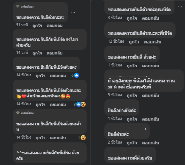 หลังจากโพสต์ดังกล่าวถูกเผยแพร่ออกไป บรรดาแฟนคลับและผู้ติดตามต่างพากันเข้ามาร่วมแสดงความยินดีอย่างล้นหลาม อาทิ พี่เบิร์ดคนดีของแผ่นดิน ขอแสดงความยินดีด้วยอย่างยิ่งค่ะ, ขอแสดงความยินดีกับพี่เบิร์ดด้วยค่ะ, ขอแสดงความยินดีกับพี่เบิร์ดด้วยนะค้าบ, ขอแสดงความยินดีกับพี่เบิร์ดด้วยนะคะ ด้วยรักและผูกพัน และอีกมากมาย