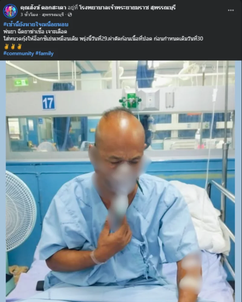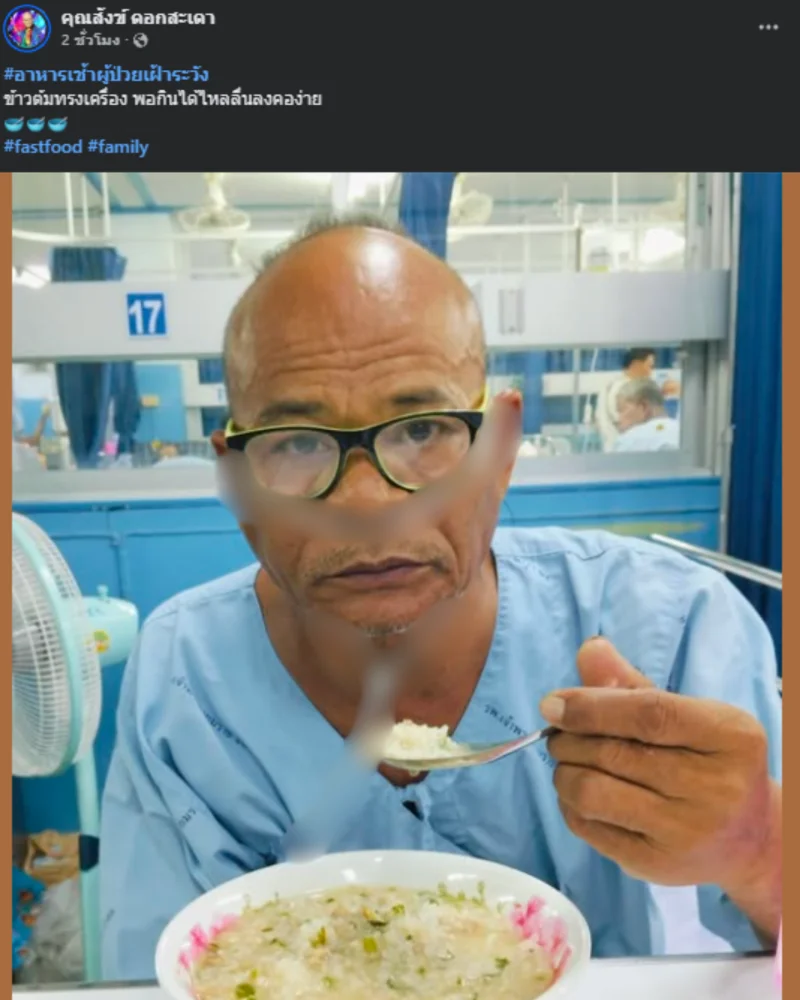 นอกจากนี้เจ้าตัวยังอัปเดตเพิ่มเติมว่า มื้ออาหารในโรงพยาบาลเป็น ข้าวต้มทรงเครื่อง อาหารเช้าผู้ป่วยเฝ้าระวัง พอกินได้ไหลลื่นลงคอง่าย