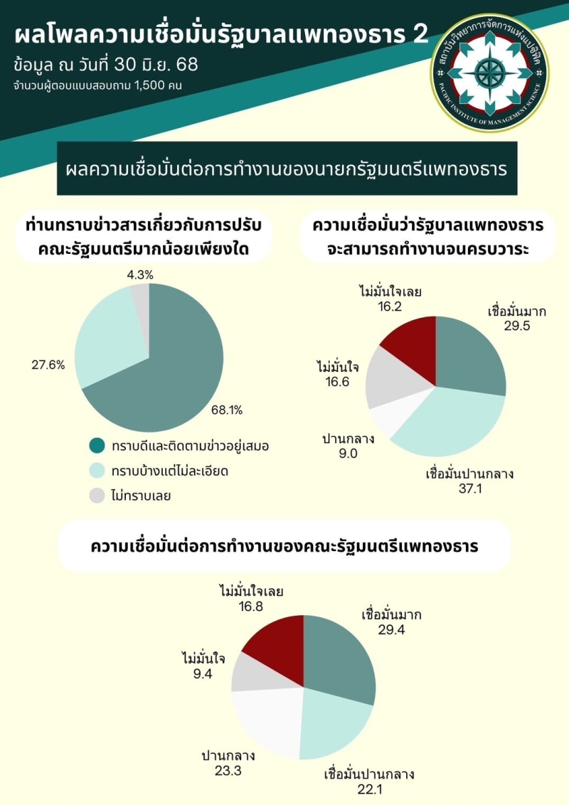 เมื่อวันที่ 30 มิถุนายน 2568 ผู้ช่วยศาสตราจารย์ ดร.พีระ พันธุ์งาม จากศูนย์สำรวจความคิดเห็น แปซิฟิคโพล สถาบันวิทยาการจัดการแห่งแปซิฟิค เปิดเผยผลการสำรวจความคิดเห็นของประชาชนทั่วประเทศจำนวน 1,500 ตัวอย่าง โดยมีค่าความเชื่อมั่นร้อยละ 95 เกี่ยวกับทัศนะต่อการทำงานของนายกรัฐมนตรีแพทองธาร ชินวัตร และการปรับคณะรัฐมนตรี