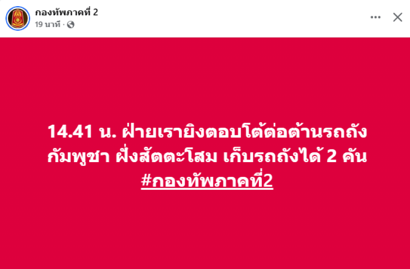 อย่างไรก็ตาม ทางกองทัพภาคที่ 2 ได้เผยแพร่ข้อมูลว่า กัมพูชาโจมตีแหล่งชุมชนโบราณสถาณ ปราสาท ปั๊มน้ำมัน โรงพยาบาล ศูนย์พัฒนาพื้นที่ชายแดน และล่าสุดนี้ กองทัพภาคที่ 2 โพสต์ข้อความผ่านเพจเฟซบุ๊ก โดยระบุว่า เวลา 14.41 น. ฝ่ายเรายิงตอบโต้ต่อต้านรถถังกัมพูชา ฝั่งสัตตะโสม เก็บรถถังได้ 2 คัน