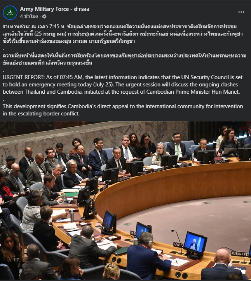 ตามรายงานจากเพจเฟซบุ๊ก Army Military Force-สำรอง ได้ระบุข้อความว่า รายงานด่วน ณ เวลา 7:45 น. ข้อมูลล่าสุดระบุว่าคณะมนตรีความมั่นคงแห่งสหประชาชาติเตรียมจัดการประชุมฉุกเฉินในวันนี้ 25 กรกฎาคม การประชุมด่วนครั้งนี้จะหารือ ถึงการปะทะกันอย่างต่อเนื่องระหว่างไทยและกัมพูชา ซึ่งริเริ่มขึ้นตามคำร้องขอของฮุน มาเนต นายกรัฐมนตรีกัมพูชา